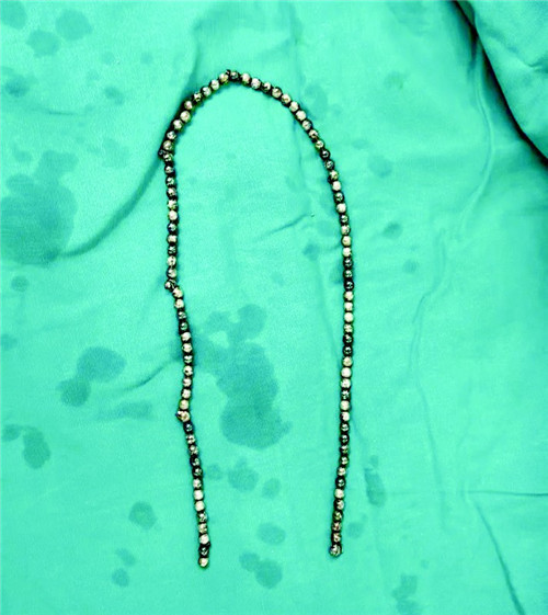 在大连市妇女儿童医疗中心(集团)体育新城院区,泌尿系超声检查发现小禾的膀胱内巨大占位,急诊将他收入内科病房,入院后,腹部CT提示膀胱内异物,呈多发球状,高密度影。医生追问病史,小禾才吞吞吐吐说出真相:原来四个月前,出于青春期对身体的好奇,小禾曾将磁力珠从尿道口塞入体内。随后小禾被迅速转入小儿泌尿外科病房。随后,医生们尝试用膀胱镜探查并取出异物,然而磁力珠被尿液长期包裹,已形成坚硬的结石外壳,根本无法通过尿道取出。情况紧急,医生当机立断改为开放手术。当切开膀胱后,一个鸡蛋大小、质地异常坚硬的灰白色团块赫然在目。当这个“石头蛋”被仔细剥离、打开后,里面竟有94颗紧密吸附在一起的磁力珠。术后,小禾恢复良好。
